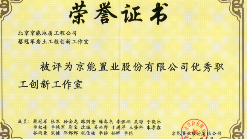 2021年12月10日,北京京能地質(zhì)工程有限公司收到了京能地產(chǎn)平臺(tái)2020 年優(yōu)秀職工創(chuàng)新工作室、科技創(chuàng)新、全員創(chuàng)新等三項(xiàng)多個(gè)榮譽(yù)證書。