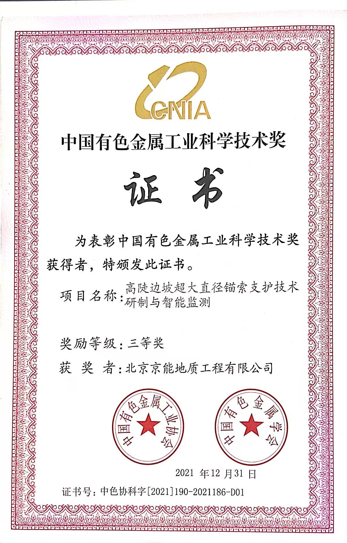 2月28日,北京京能地質(zhì)工程有限公司報(bào)送的《高陡邊坡超大直徑錨索支護(hù)技術(shù)研制與智能監(jiān)測(cè)》成果喜獲2021年度中國(guó)有色金屬工業(yè)科學(xué)技術(shù)獎(jiǎng)三等獎(jiǎng)證書(shū)。