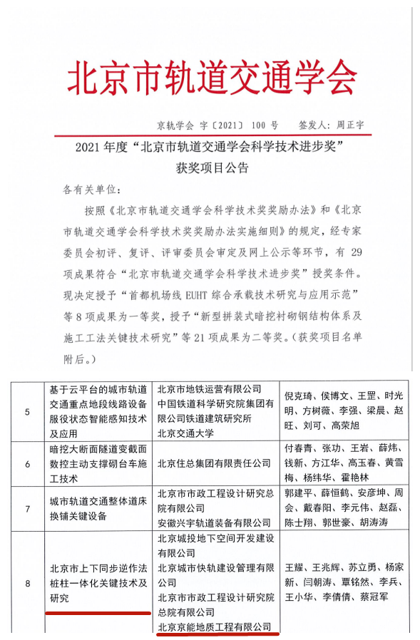 7月21日,北京市軌道交通學(xué)會公布《2021年度“北京市軌道交通學(xué)會科學(xué)技術(shù)進步獎”獲獎項目公告》(京軌學(xué)會字[2021]100號),北京京能地質(zhì)工程有限公司的《北京市上下同步逆作法樁柱一體化關(guān)鍵技術(shù)及研究項目》榮獲北京市軌道交通學(xué)會科學(xué)技術(shù)進步獎”二等...