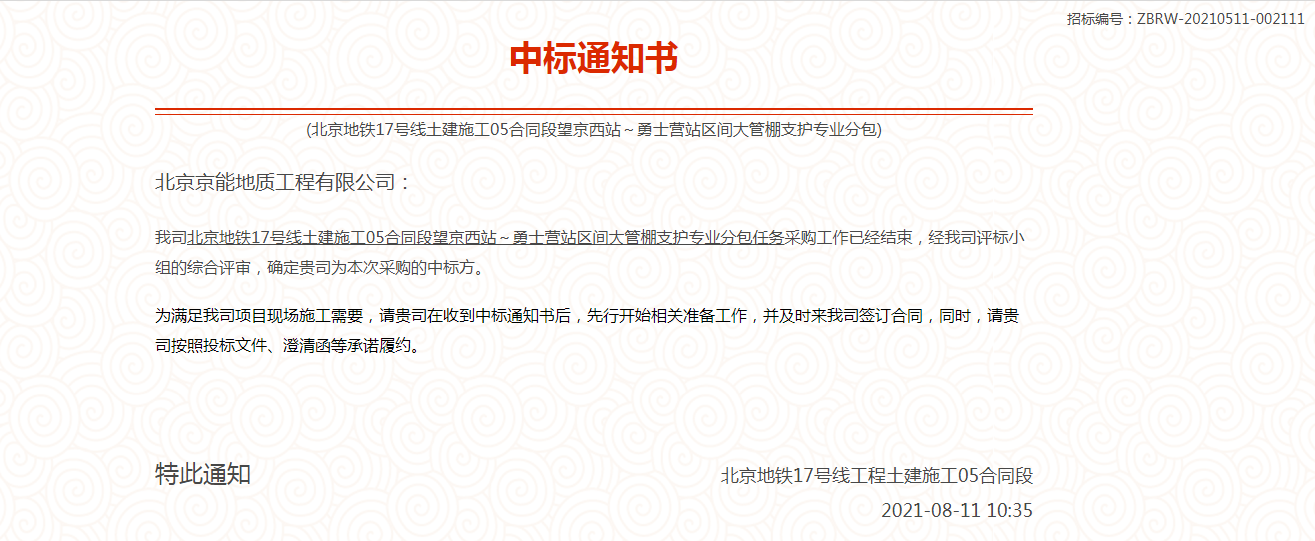 近日,北京京能地質(zhì)工程有限公司成功中標“北京地鐵 17 號線土建施工 05 合同段望京西站——勇士營站區(qū)間大管棚支護”項目。