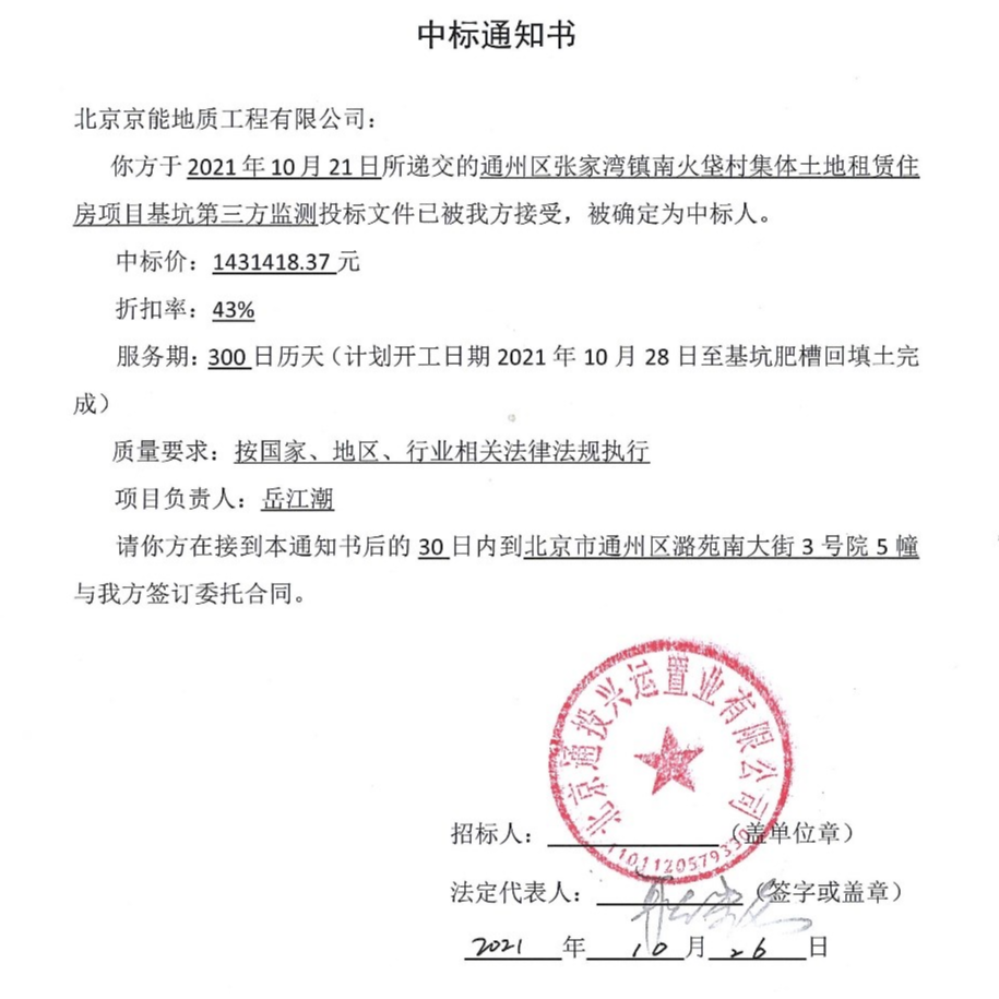 近日,北京京能地質(zhì)工程有限公司成功中標“通州區(qū)張家灣鎮(zhèn)南火垡村集體土地租賃住房項目基坑第三方監(jiān)測項目”,中標金額1431418.37元。