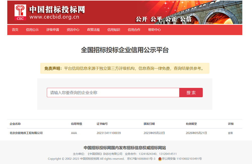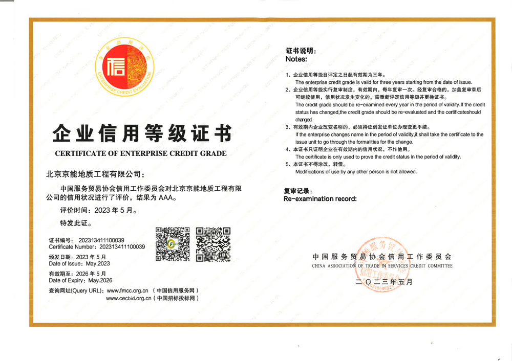 近日,北京京能地質(zhì)工程有限公司順利完成企業(yè)信用評(píng)價(jià)的復(fù)評(píng)工作,再次成功取得企業(yè)信用等級(jí)AAA級(jí)證書(shū)。