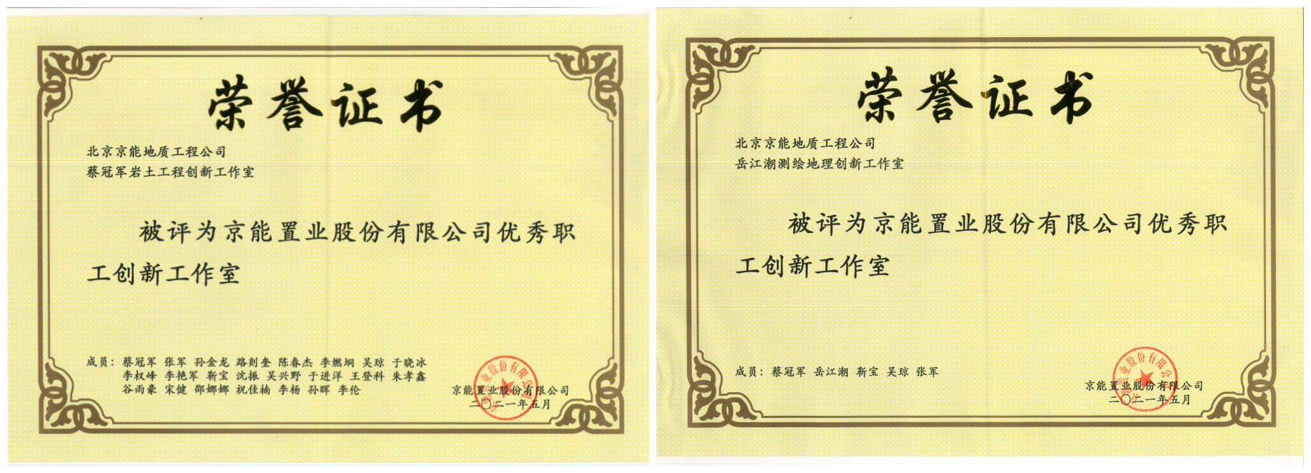 2021年12月10日,北京京能地質(zhì)工程有限公司收到了京能地產(chǎn)平臺2020 年優(yōu)秀職工創(chuàng)新工作室、科技創(chuàng)新、全員創(chuàng)新等三項多個榮譽(yù)證書。